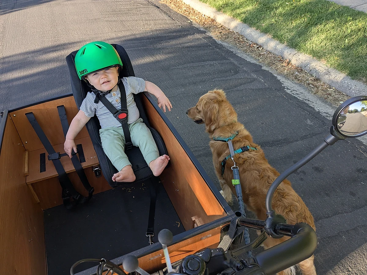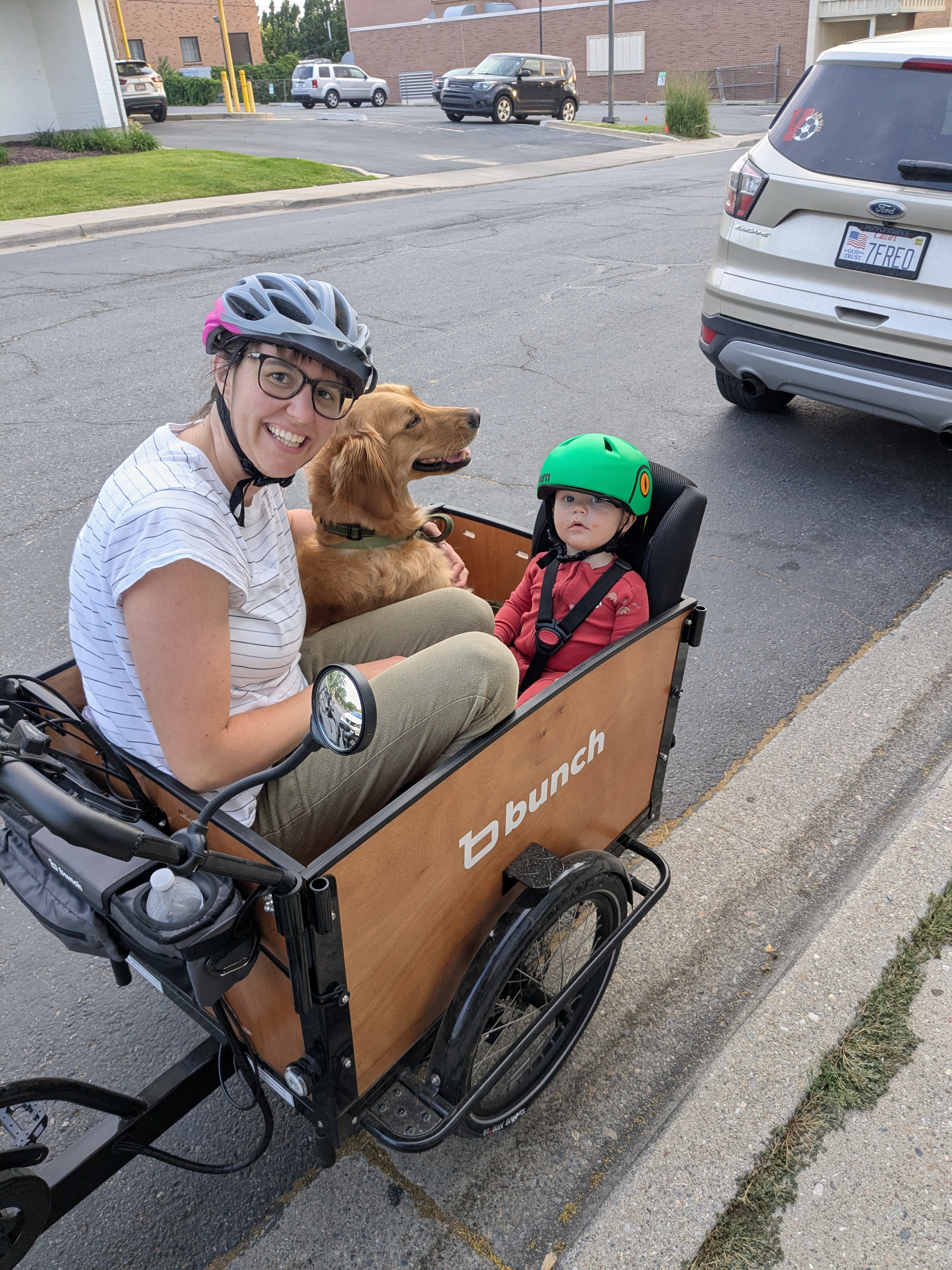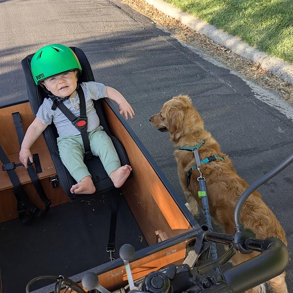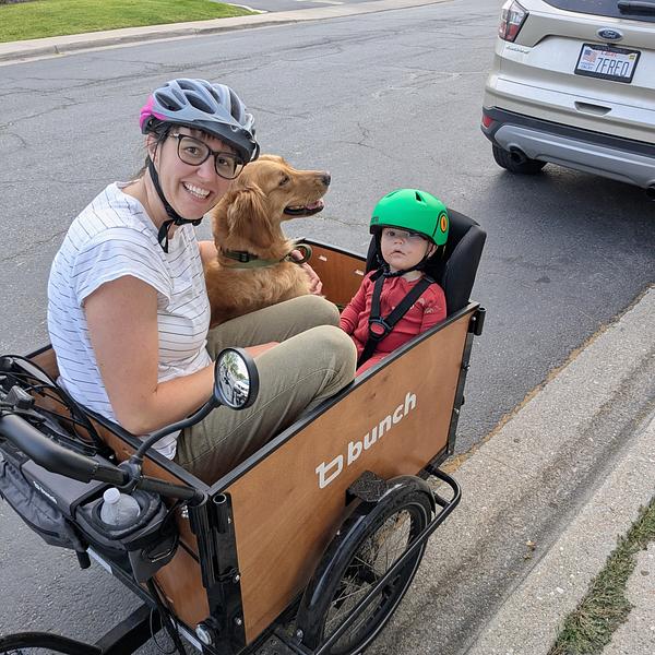 We decided to get a Bunch Bike after I was diagnosed with a neurologic disorder that affected my mobility. I was struggling to run errands, go to the park with my kids, or just get outside. Now I use it every day! We ride to the store, to appointments, to the park, to neighbors, to local events, or just to ride. We also found a way to safely take our sweet golden retriever on long jogs while we cruise comfortably beside her. The first time taking her jogging after my diagnosis was pure joy! (For her and me!) I love talking to my babies while I ride! We have such a good time on our bike. I don't have good balance so having three wheels was a must for me. I am also really thankful for the extra accessories (lights, blinkers, horn, wheel lock, mirrors, etc.) to make riding easier for me. My only wish is that I could power up those hills without having to pedal on my low energy days.