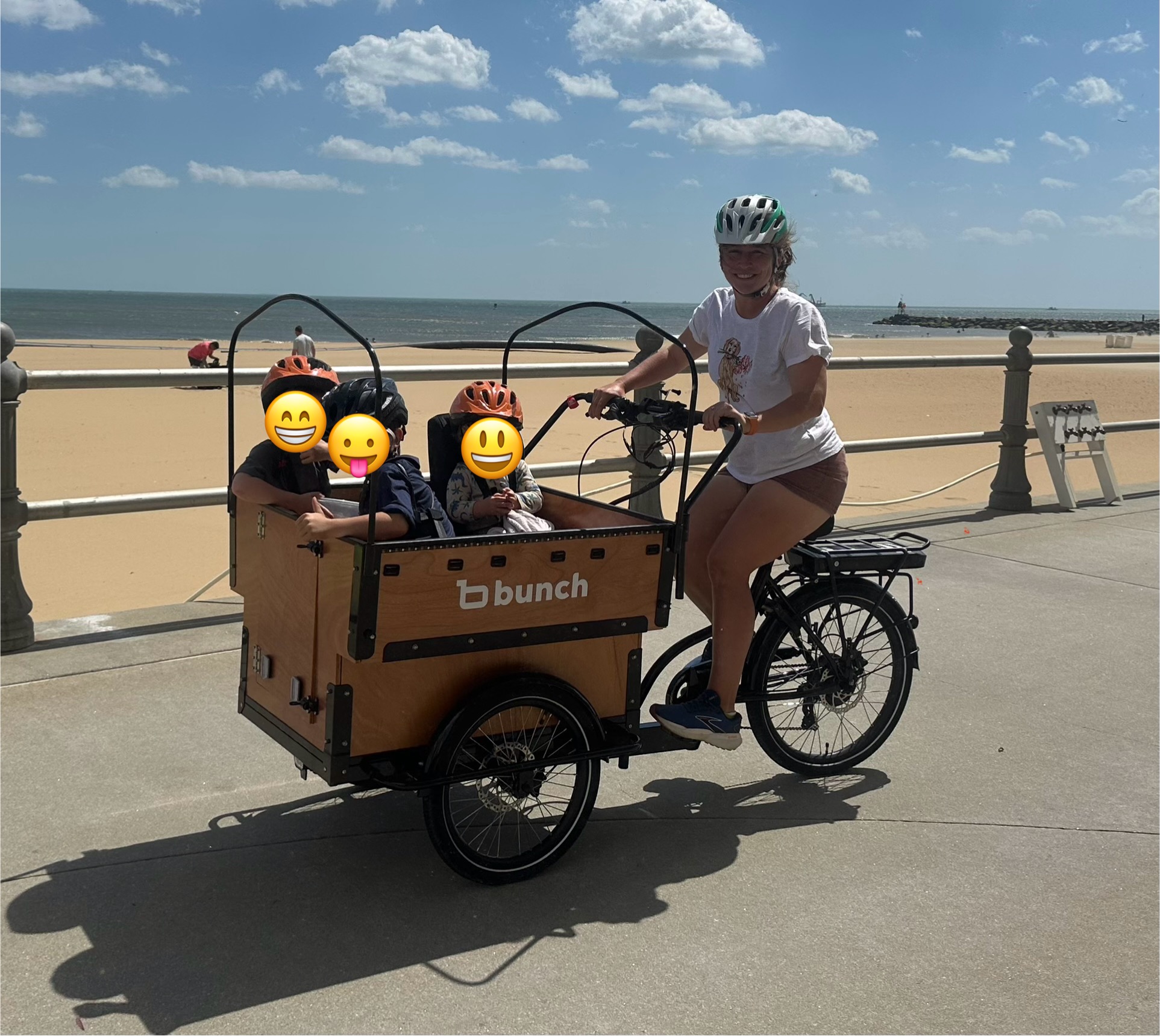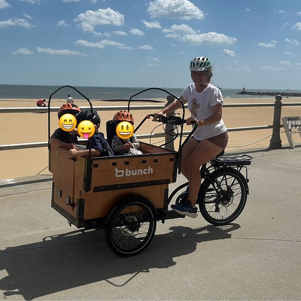 We are a Navy family with three active boys and a golden retriever named Yankee Doodle! The bunch bike is a game changer for our family and it’s to the point where our boys are upset to take the car anywhere, we prefer to bunch! We initially purchased the bike due to my limited driving abilities and my husband in and out with the Navy but he now uses it as well. We love our bunch bike because of the interaction and joy added to our daily commutes. We sometimes ride our bunch bike 15miles in a day between school errands and activities. What was a routine trip became an adventure, we count how many trucks we see, bounce along to music and wave to cars along the way. It has turned a burdensome long commute to a fun connection we share. The only pitfall is we have to ride on an uneven sidewalk most of the time. This can make our trip a bumpy ride.