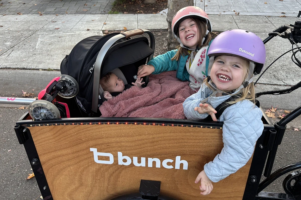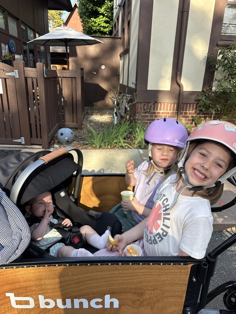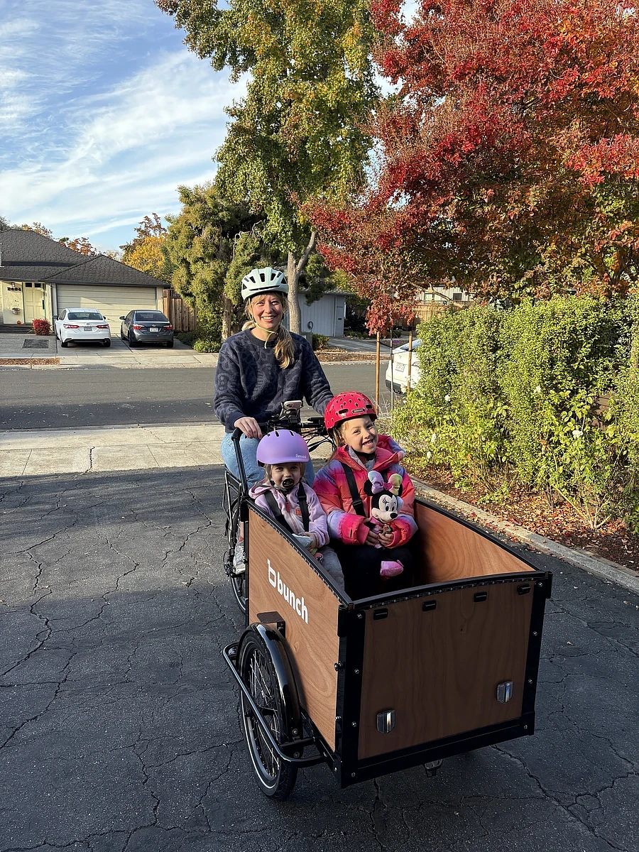 I have wanted a front-loading cargo bike for years! When we settled into our new home in California, I decided the Bunch Bike was the perfect one for us! We live on a bike boulevard in Palo Alto (woohoo, bike infrastructure!) and use the bike to take my three daughters to school every day, parks, grocery shopping, church, the movie theater, hiking, etc. We have put almost 1,000 miles on the bike in our first five months! We rarely drive the family car and my daughters have a strong preference for the bike. I love being able to use active transportation and feel like I am a member of our community while traveling! It is easy to stop and chat with friends we run into, talk to my kids and reach things they need, grab the errant stuffed animal that gets thrown out by my toddler, and enjoy being outside and together. I love how stable the trike style is and so I feel no stress when I need to hop off the bike and it is easy for my older daughter to get in and out herself. The ride can sometimes be bumpy — the padded seats are helpful for that.