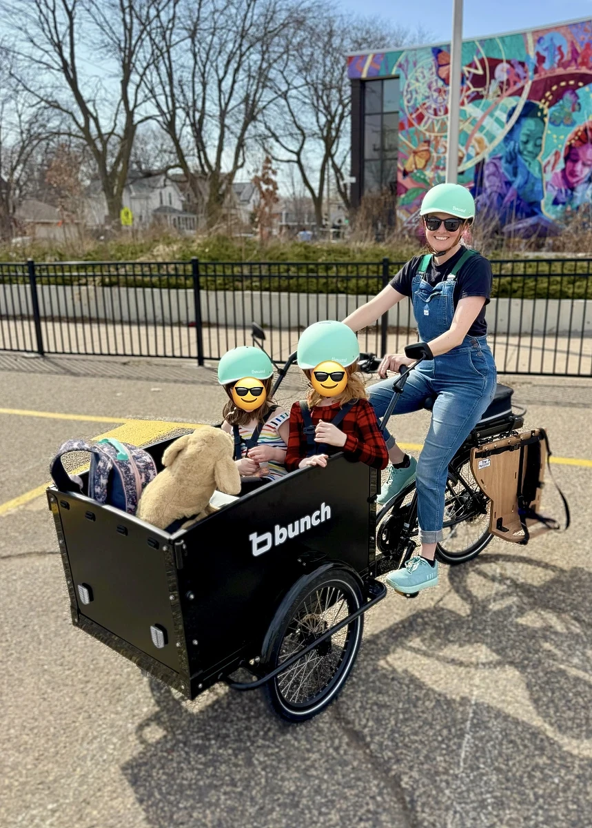 Our Bunch bike allowed us to get rid of our 2nd car. We use it to get our kids to school, to get groceries, go shopping, get dinner, to the library, etc. We LOVE the stability, size, durability, customer service, accessories of our Bunch bike. The handling takes some getting used to (esp for folks who ride 2 wheel bikes a lot), which is why I am glad to be able to offer my bike for test rides so folks can get a feel for it! I run the Minneapolis Cargo Bike Library, which offers short term rentals of our Bunch bike along with several other styles of electric cargo bikes.