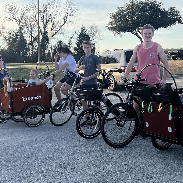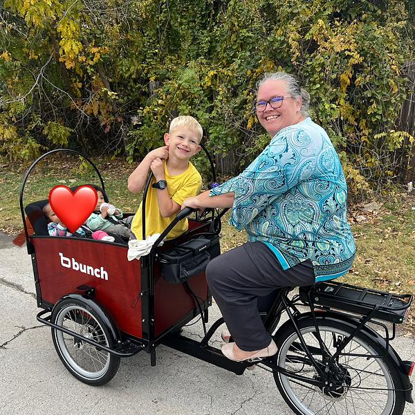 I got inspired by other communities to start biking our kids to school. I was listening to a family biking podcast. They mentioned Bunch Bikes and that it was located in our area, so my daughter-in-law and I went out for a tour and a ride and we loved it. We now both have bikes and are having so much fun with them! I love that it fits so many kids, including the littlest ones! I love that the kids are in the front so that we can talk and share our experience. I love that it has encouraged us to get out more and to visit new places and develop new habits. I don't love that it's so hard to transport by car. It can be difficult to move around and position properly. I don't love that it needs to be ridden in the street, it does not handle sidewalks well.
