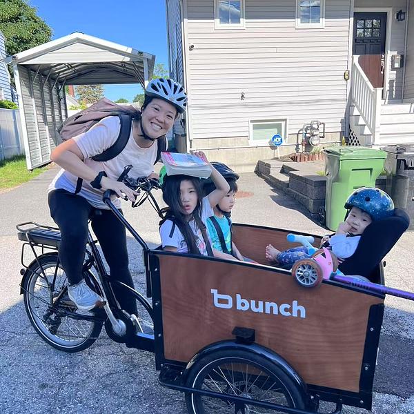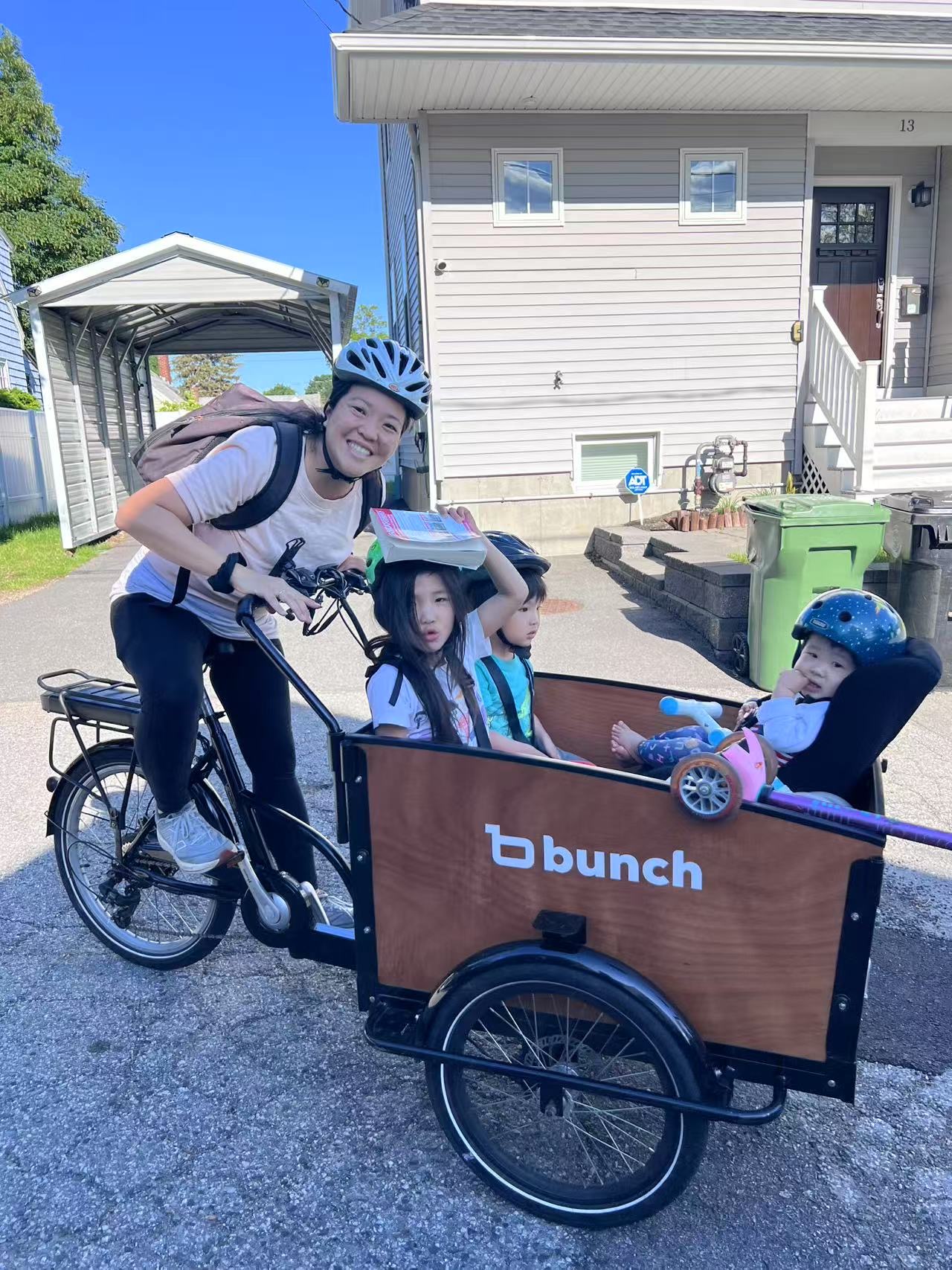 I had been eyeing the Bunch for a long time - when we had our third kid, I knew it had to be done! I love that all my kids (and a friend) can ride together when we go to 3 different school drop offs, splash pads, gymnastics, the works. I love that the kids can sit together and we can enjoy the city together. I don’t like the rattling when the seats are empty.
