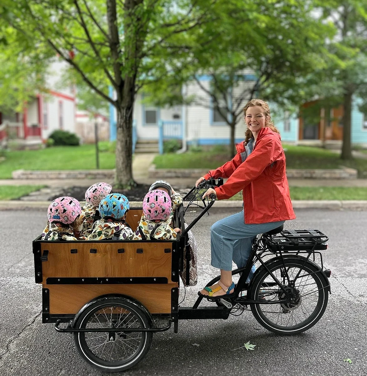 We use our bunch bike for daily field trips for our small nature school in downtown Indianapolis. We decided on this bike and company because it was US based! I love how easily it carries all 6 of my preschoolers + all of our gear! I wish we had a rain tent that fit a little better, ours is too small.