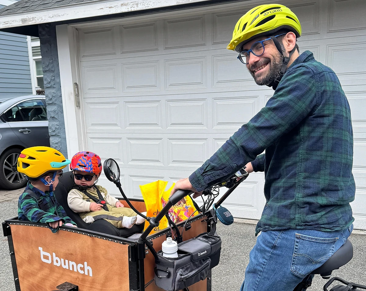 We wanted an easy and fun way to transport our kids to school, the playground, and on other adventures throughout Somerville without needing to stick everyone in a car. We looked at many other cargo bikes and decided on a Bunch because of the stability with multiple kids (or adults) and the ability to carry our entire family at the same time. Love the ability to see and talk to my son on the way to school and his excitement with riding in the Bunch and seeing the world around him. Downsides: The ride can be bumpy when the cargo box is unladen. Getting used to the three wheels of a tricycle helps but some bumps are unavoidable.